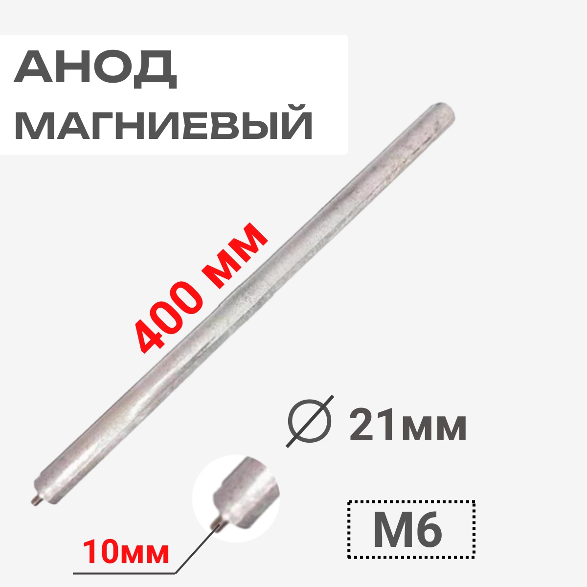 Магниевый анод длина 400 мм, диаметр 21 мм, шпилька 10 мм, резьба M6 100417