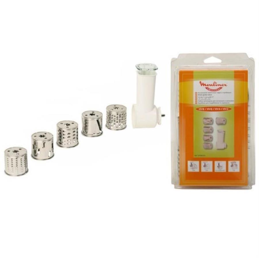 Комплект насадок овощерезки для мясорубки Moulinex. В комплект входят насадки: SS-989852 Барабанчик №1 (сырная тёрка), SS-989853 Барабанчик "C" (крупная тёрка), SS-989854 Барабанчик №3 (мелкая тёрка), SS-989855 Барабанчик "A" шинковка (ломтики), SS-989856 Барабанчик "F" (тёрка для шоколада и льда), SS-989859 Корпус тёрок с толкателем. Подходит для следующих типов мясорубок : HV2, HV3, HV4, HV6, HV8, МОДЕЛЕЙ : A1334G(1), A1334S(0), ADR741(0), ADR741(P), ADR741(Q), ADR743(0), ADR743(P), ADR743(Q), ADR744(0), ADR744(P), ADR744(Q), ADR841(0), ADR841(P), ADR841(Q), DKA14E(0), DKA213E/350, DKA242(0), DKA24E(0), DKA24E/350, ME20513E/350, ME206181/350, ME208139/350, ME208139/35A, ME209139/350, ME209139/35A, ME211830/350, ME400188/35, ME401188/35, ME403189/35, ME405B3E/350, ME40613E/350, ME406185/350, ME406185/35A, ME41013E/350, ME41113E/350, ME41313E/350, ME41513E/350, ME41513E/35A, ME416138/350, ME416138/35A, ME421039/35A, ME428139/350, ME428139/35A, ME440139/35A, ME442139/35A, ME452839/35A, ME454139/35A,