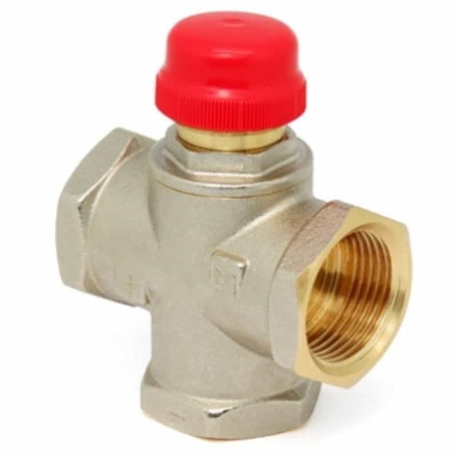 Клапан предназначен для использования в смесительных узлах гидравлических систем (байпасные узлы подмеса, узлы смешения для получения заданного уровня температуры смешанной жидкости и т.п.). Регулирование клапаном может осуществляться вручную или с помощью сервопривода. Корпус выполнен из латуни марки CW617N (европейский стандарт EN 12165), никелирован. Материал штока, основания золотника и пружины – нержавеющая сталь марки AISI 316, золотникового уплотнителя – EPDM. Резьба присоединительных патрубков – внутренняя, 1". Данная модель – повышенной пропускной способности, с боковым смешением, для установки в байпас без возможности его полного перекрытия (такая схема позволяет обойтись без перепускного клапана). Клапан не обеспечивает полного перекрытия потока.